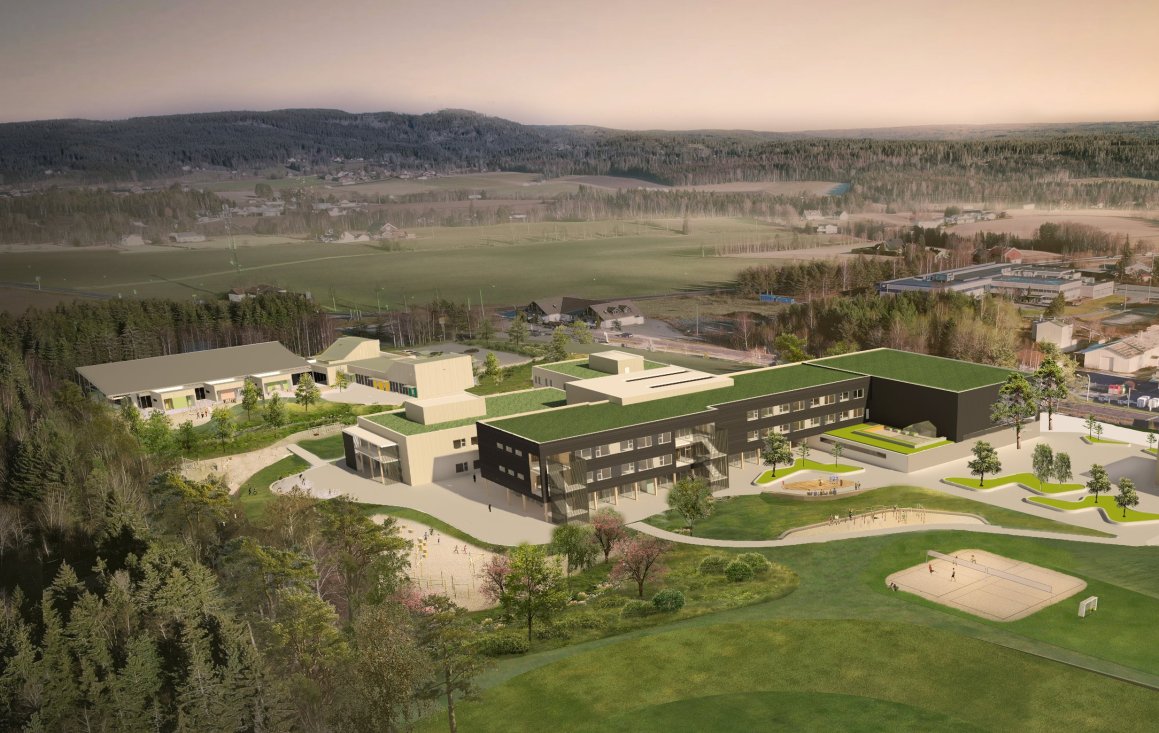 Aurskog-Høland kommune bygger ny barnehage, 1-10 skole, flerbrukshall og svømmebasseng sentralt på Aursmoen. Prosjektet som ferdigstilles i 2025 bærer preg av at det er høye krav til bærekraftige løsninger.